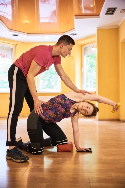- мінімальна кількість інвентарю, абсолютна відсутність дороговартісних тренажерів, що дає можливість займатися з фізичним терапевтом онлайн з дому через відео звʼязок;